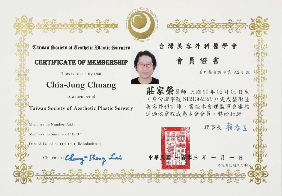 台灣美容外科醫學會員第A231號